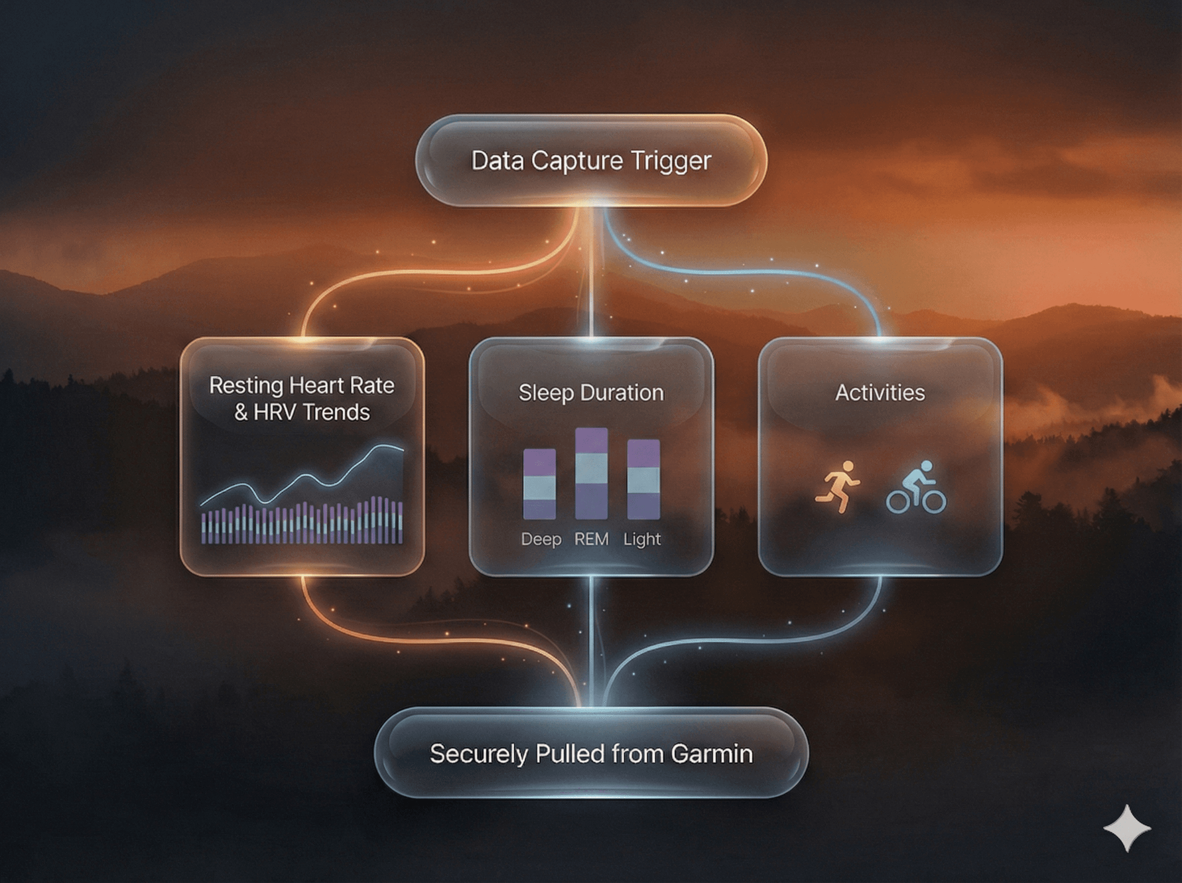 Securely synchronize your Garmin Connect™ account. Topsy pulls specific historical and daily metrics including HRV trends, resting heart rate, and sleep architecture to establish your physiological baseline.